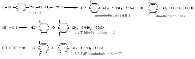 Hormonii tiroidieni sunt reprezentaţi de 3,5,3’ triiodotironina (T3) şi 3,5,3’,5’ tetraiodotironina (tiroxină, T4).