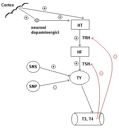- Factori corticali precum stressul sau subcorticali precum febra pot stimula neuronii parvicelulari din aria hipofiziotropă şi prin eliberarea de TSH creşte sinteza hormonilor tiroidieni; sau pot stimula neuroni dopaminergici care sunt în conexiune cu neuronii hipofizari, având acelaşi efect