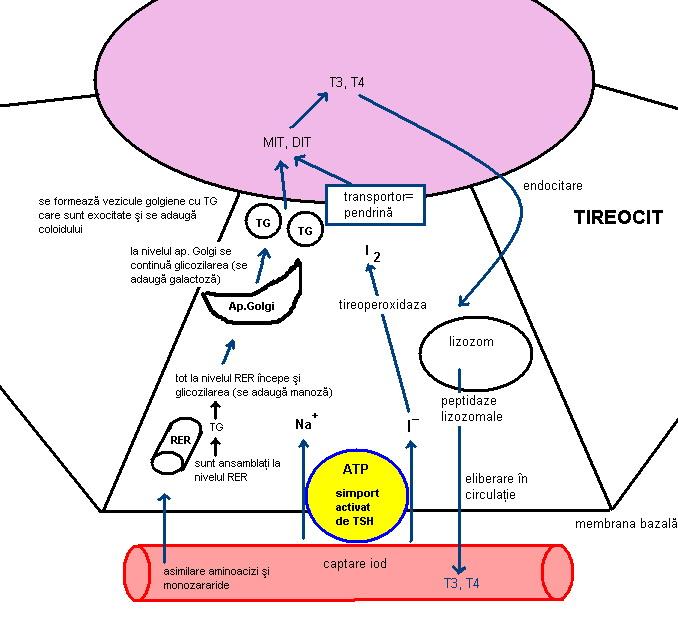 În paralel are loc captarea iodului la polul bazal al tireocitului. Transportul acestuia prin membrana plasmatică bazală se face printr-un proces activ, consumator de ATP, împotriva gradientului de concentraţie – o pompă bazată pe simport Na+/I-, care este activată de TSH. Iodul este transportat către membrana plasmatică apicală şi este oxidat sub acţiunea tireoperoxidazei la I2, după care traversează membrana plasmatică apicală cu ajutorul unui transportor = pendrină. Ajunge în coloid, unde are loc iodarea resturilor de tirozină din TG sub acţiunea tireoperoxidazei şi rezultă monoiodtirozina (MIT) şi diiodtirozina (DIT). Cuplarea a 2 molecule de DIT formează T4, iar cuplarea a câte o moleculă de MIT cu DIT formează T3 (3,5,3’ triiodotironina) sau rT3 (3,3’,5’ triiodotironina). Click aici pentru o schemă a structurii biochimice a hormonilor tiroidieni.
