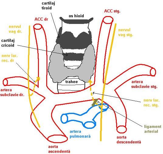 Inervaţie: fibre simpatice din ganglionii simpatici cervicali + fibre parasimpatice din vag prin nervii laringei recurenţi (raport important în chirurgia tiroidei deoarece lezarea acestui nerv poate duce la tulburări de fonaţie prin paralizia corzii vocale).