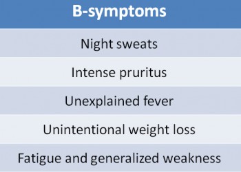 Simptomele B (B-symptoms) sau simptomele constitutionale se refera la simptomele sistemice de febra, transpiratii nocturne si scădere ponderala.