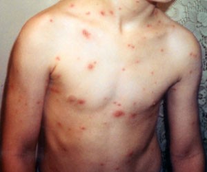 Valurile de viremie se succed, ceea ce explică şi polimorfismul infecţiei: maculele sunt simultane cu papulele şi veziculele. Numărul elementelor eruptive se limitează de obicei la câteva sute, dar la persoanle adulte sau la cele imunodeprimate erupţia este mai bogată.